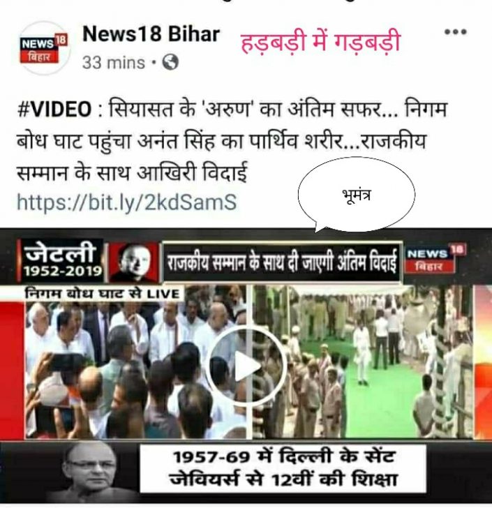 दिल्ली। पिछले कुछ समय से अनंत सिंह चर्चा में है। बिहार पुलिस से आंख-मिचौली और फिर दिल्ली के कोर्ट में समर्पण की घटनाएं खबरों की दुनिया में छायी रही। लेकिन आज न्यूज़ 18 ने उन्हें तब जीते जी मार डाला और उन्हें निगम बोध घाट तक पहुंचा दिया। दरअसल खबर अरुण जेटली की अंतिम यात्रा से संबंधित थी लेकिन लिख दिया गया कि निगम बोध घाट पहुंचा अनंत सिंह का पार्थिव शरीर। आप भी देखिए न्यूज़18 की गलती।।