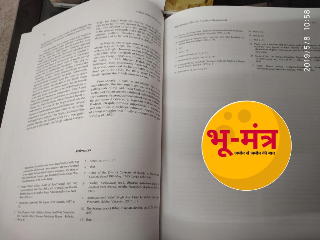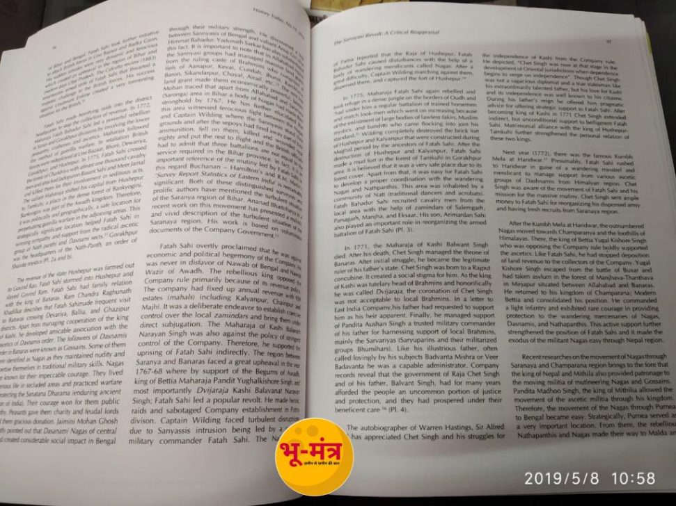 पहली बार अंतरराष्ट्रीय जनरल हिस्ट्री टुडे में डा आनंदवर्धन द्वारा लिखे गये लेख “The Sanyasi Revolt: A Critical Reappraisal” में किया गया है इस लेख में हुशेपुर-गोपालगंज बाद में तमकुही-गोरखपुर के राजा फतह बहादुर शाही, मकसूदपुर राज्य गया के राजा पंडित पीताम्बर सिंह एवं बनारस के राजा चेत सिंह साथ ही बेतिया के राजा युगल किशोर सिंह (ये चारों ही भूमिहार ब्राह्मण कुल के थे) के द्वारा सन्यासियों को दिये गये नेतृत्व और कंपनी सेना को युद्ध मे पहुचाई गई व्यापक क्षति का व्यापक वर्णन किया गया है। इसके अलावा भवानी पाठक (बक्सर के जासो गावँ के भूमिहार ब्राह्मण) द्वारा बंगाल में क्रांति के नेतृत्व की परिचर्चा भी की गई है।