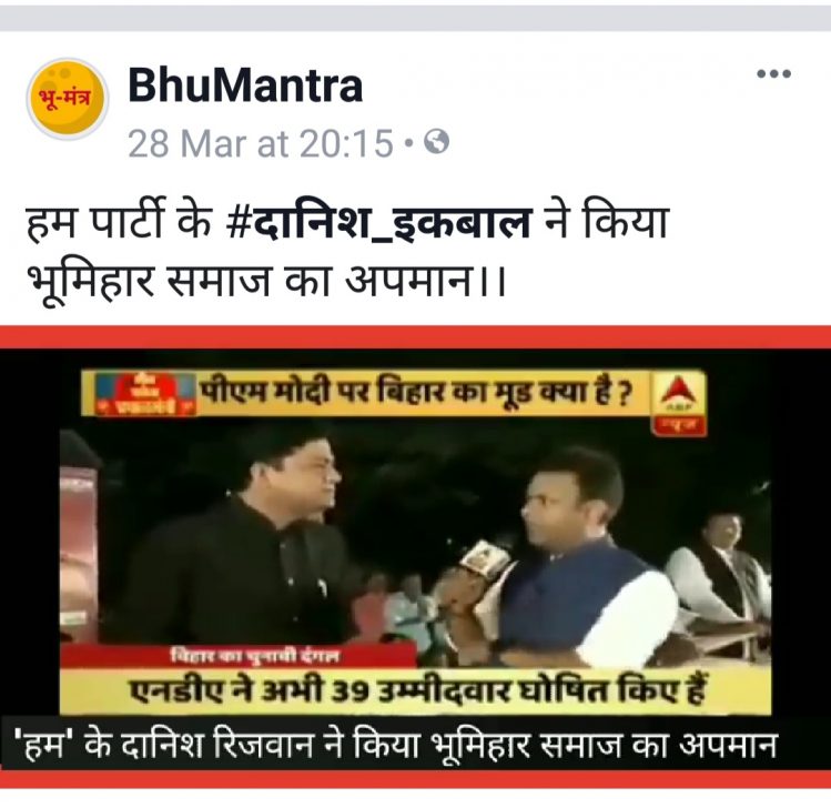 दिल्ली/पटना। एबीपी न्यूज़ के एक कार्यक्रम में भूमिहार समाज के लिए अपमानजनक टिप्पणी करने वाले ‘हम’ पार्टी के नेता दानिश रिज़वी ने आज सोशल मीडिया (फेसबुक और ट्विटर) के जरिये भूमिहार समाज से माफी मांगी है। गौरतलब है कि भूमंत्र ने कल इस बाबत खबर प्रकाशित की थी जिसके बाद भूमिहार समाज आक्रोश में था और लोकसभा चुनाव में हर जगह ‘हम’ के प्रत्याशियों के बायकॉट की घोषणा की थी। विरोध को देखते हुए दानिश रिजवान ने आज माफी मांगते हुए लिखा –