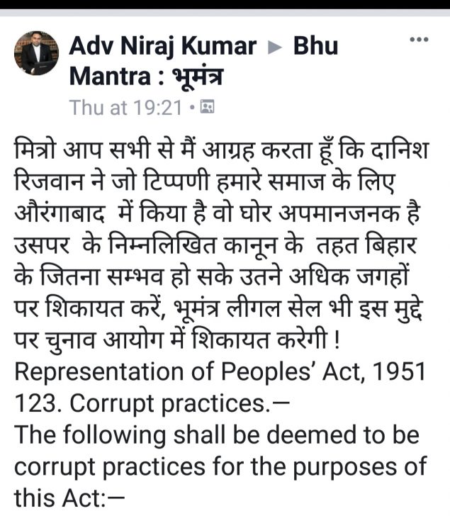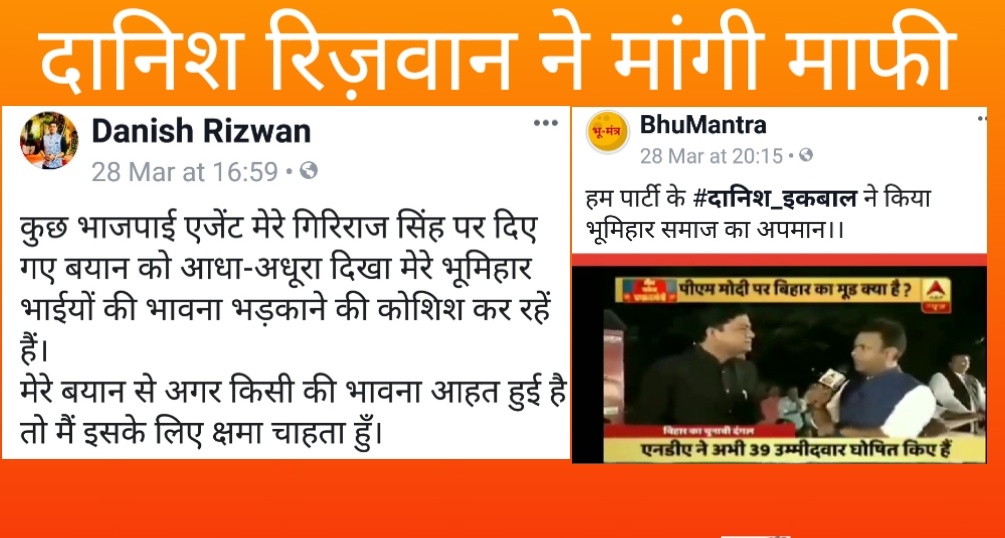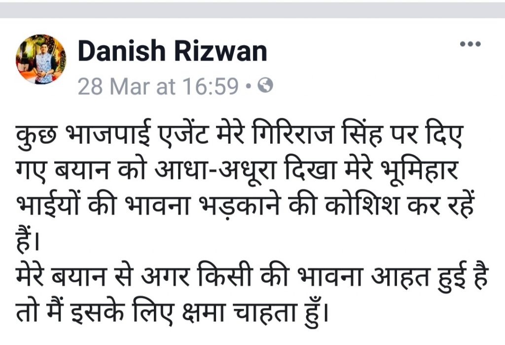 दानिश रिज़वी : “कुछ भाजपाई एजेंट मेरे गिरिराज सिंह पर दिए गए बयान को आधा-अधूरा दिखा मेरे भूमिहार भाईयों की भावना भड़काने की कोशिश कर रहें हैं।मेरे बयान से अगर किसी की भावना आहत हुई है तो मैं इसके लिए क्षमा चाहता हुँ।”