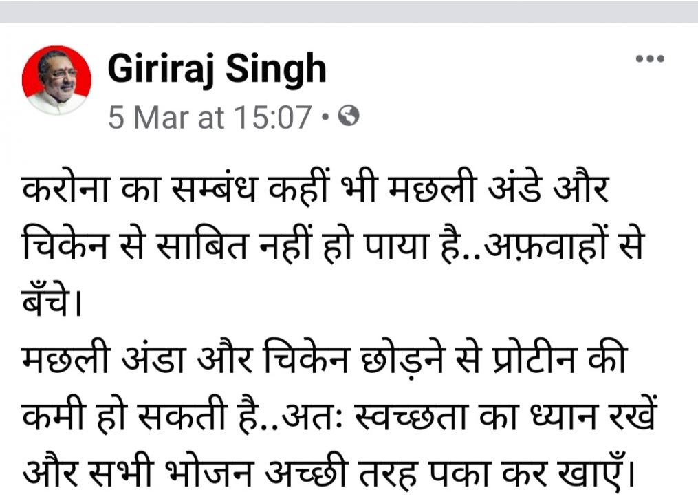 पशुपालन, डेयरी और मत्स्य पालन विभाग के केंद्रीय मंत्री गिरिराज सिंह के बारम्बार अपील के बावजूद पोल्ट्री उद्योग को भारी नुकसान हुआ है और इससे जुड़े लोग तबाही के मुहाने तक पहुँच गए हैं. दरअसल ये भ्रांति पिछले कुछ समय से तेजी से फैला है कि मांसाहर से कोरोना संक्रमण का ख़तरा बढ़ जाता है. चिकन से कोरोना वायरस फैलने की अफवाहों के कारण चिकन सस्ता हो गया है।