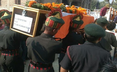 शहीद राजीव कुमार राय जम्मू = कश्मीर में तैनात थे और पाकिस्तान की ओर से हुई भीषण गोलीबारी में मारे गए थे. राजीव कुमार राय का पार्थिव शरीर आज उनके गांव वैशाली जिले के महुआ पहुंचा. राजीव का शव पहुंचते ही पूरा गांव गम में डूब गया. चारों ओर शोक की लहर दौड़ गयी. इतना ही नहीं पूरा गांव उमड़कर राजीव के घर पहुंचा और स्थानीय ग्रामीणों के अलावा हजारों लोगों ने भारत-माता की जय के नारे के साथ अपने शहीद जवान को आखिरी विदाई दी.